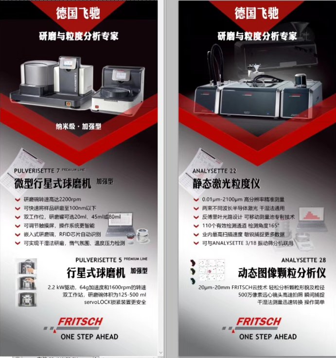 FRITSCH剑开双刃,一面是高能高效的实验室研磨粉碎设备,另一面是由激光粒度仪与动态图像分析仪组成的精确稳定颗粒粒径与形貌表征ANALYSETTE系列。