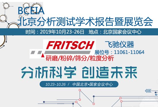 “分析科学,创造未来”。第十八届北京分析测试学术报告会暨展览会(BCEIA 2019)将于2019年10月23-26日在北京国家会议中心举行,实验室仪器专业制造厂商德国FRITSCH公司再度盛装亮相此次盛会,带来全新的研磨、粒度分析技术与设备。